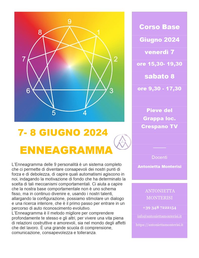 Il sistema ha alla base l’autoriconoscimento della propria base tipologica secondo una serie di stimoli e test. Nei due giorni di corso apprenderemmo i fondamentali del Enneagramma e che questo è il metodo migliore per comprendere profondamente te stesso e gli altri, per vivere una vita piena di relazioni costruttive e amorevoli, sia nel mondo degli affetti che del lavoro.