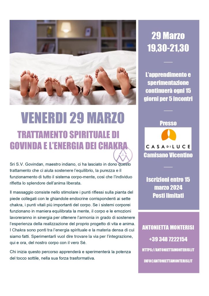 La stimolazione dei punti riflessi, viene fatta con movimenti rotatori dei pollici, è accompagnata da suoni chiamati mantra. L’azione combinata della stimolazione fisica e sonora aumenta l’efficacia del trattamento che, arriva ad influenzare profondamente la psiche e lo spirito della persona che lo riceve. Gli incontri saranno 5 a cadenza ogni 15 giorni.